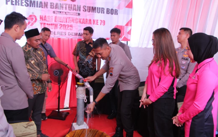 DEMAK || Portaljatengnews.com – Dalam rangkaian peringatan Hari Bhayangkara ke-79, Kepolisian Resor (Polres) Demak meresmikan sumur bor di Dukuh Pongangan, Desa Purworejo, Kecamatan Bonang, Kabupaten Demak. Peresmian ini dipimpin langsung oleh Kapolres Demak AKBP Ari Cahya Nugraha, Jumat (22/8/2025).