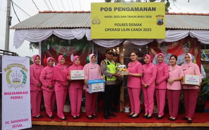 Pada kesempatan tersebut, Ketua Bhayangkari Cabang Demak Ny. Victoria Ari turut menyerahkan tali asih berupa bingkisan berisi makanan kepada personel pengamanan sebagai bentuk dukungan dan apresiasi atas dedikasi anggota Polri yang bertugas selama Nataru.