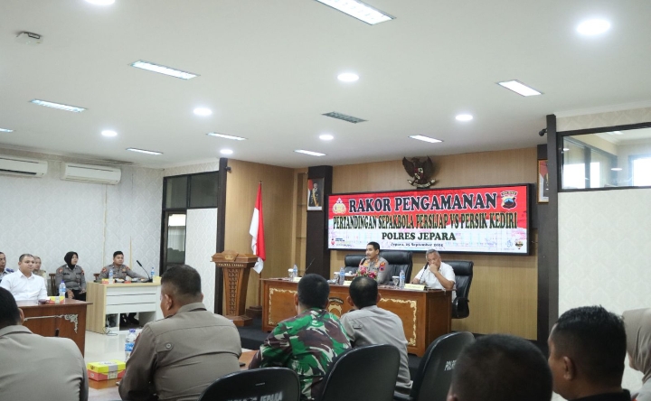 JEPARA || Portaljatengnews.com – Rakor lintas sektor guna mematangkan skema pengamanan mulai dari dalam stadion hingga titik-titik strategis di luar arena pertandingan yang melibatkan unsur penting, antara lain panitia pelaksana (panpel), perangkat pertandingan, keamanan internal klub, TNI, Pemerintah Daerah, hingga stakeholder terkait berlangsung di aula Mapolres Jepara, Kamis (25/9/2025).