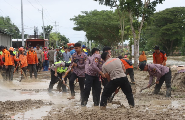 Personel gabungan TNI, Polri, BPBD, PMI bersama masyarakat juga melakukan kerja bakti membersihkan lumpur yang menutup badan jalan guna mempercepat pemulihan akses transportasi.