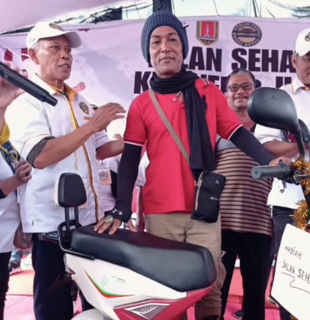 Pemenang lomba jalan sehat, saat mendapatkan hadiah sepeda motor listrik.