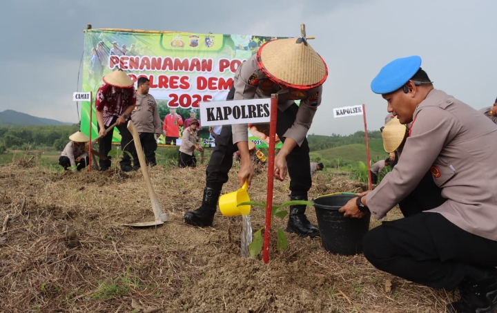 DEMAK || Portaljatengnews.com – Kepolisian Resor (Polres) Demak kembali menunjukkan komitmennya dalam menjaga kelestarian lingkungan dengan menggelar kegiatan penanaman pohon di lahan milik Perhutani yang berada di Desa Wonosekar, Kecamatan Karangawen, Kabupaten Demak, Kamis (18/12/2025).