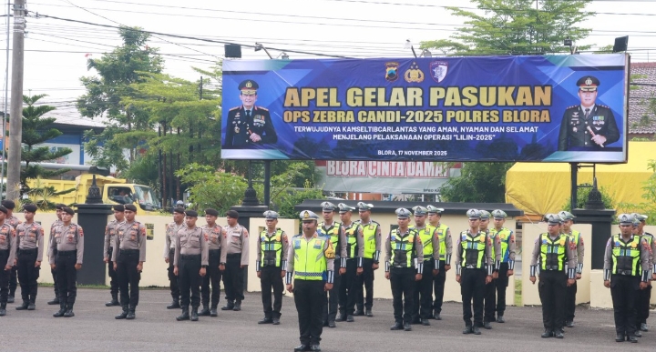 BLORA || Portaljatengnews.com – Kepolisian Resor (Polres) Blora secara resmi memulai Operasi Zebra Candi 2025. Apel Gelar Pasukan dilaksanakan di halaman Mapolres Blora pada Senin (17/11/2025) pukul 08.00 WIB. Operasi ini akan berlangsung selama 14 hari, hingga 30 November 2025, dengan tujuan utama menekan angka kecelakaan dan pelanggaran lalu lintas di Kabupaten Blora.