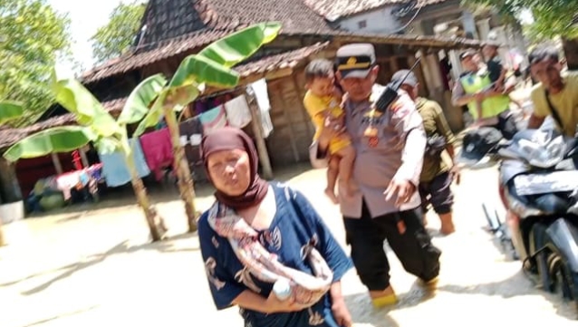 Di tengah kondisi tersebut, aparat Kepolisian bersama warga dan relawan tetap berupaya melakukan penanganan, termasuk menutup titik-titik tanggul yang jebol menggunakan karung berisi tanah guna menahan laju air.