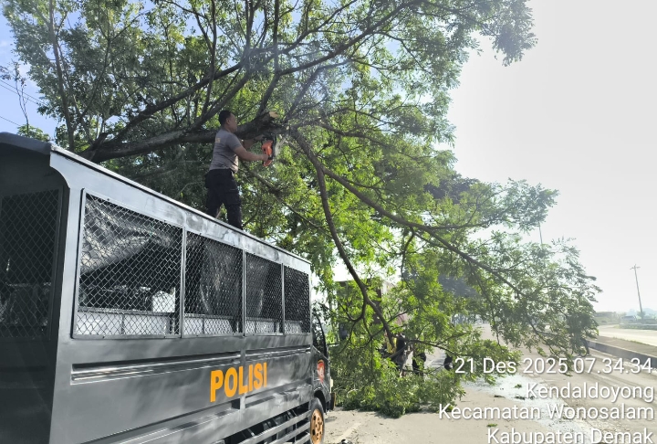 DEMAK || Portaljatengnews.com – Kepolisian Resor (Polres) Demak, Jawa Tengah, bersama Badan Penanggulangan Bencana Daerah (BPBD) Kabupaten Demak melakukan evakuasi pohon tumbang di exit Tol Kadilangu, Minggu (21/12/2025) pagi. Peristiwa tersebut terjadi sekitar pukul 07.00 WIB dan langsung mendapat penanganan cepat dari petugas gabungan.